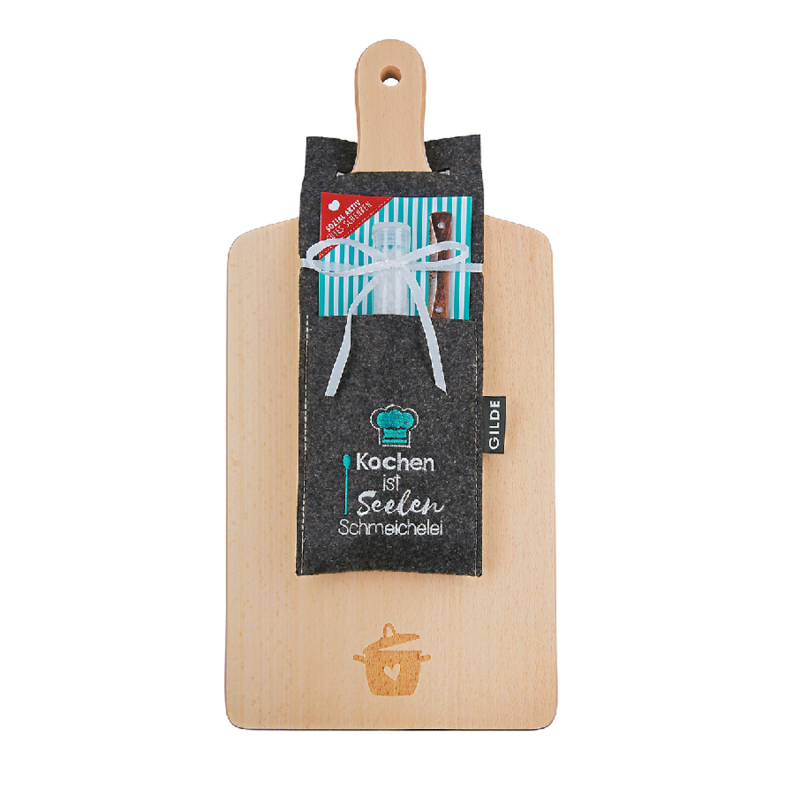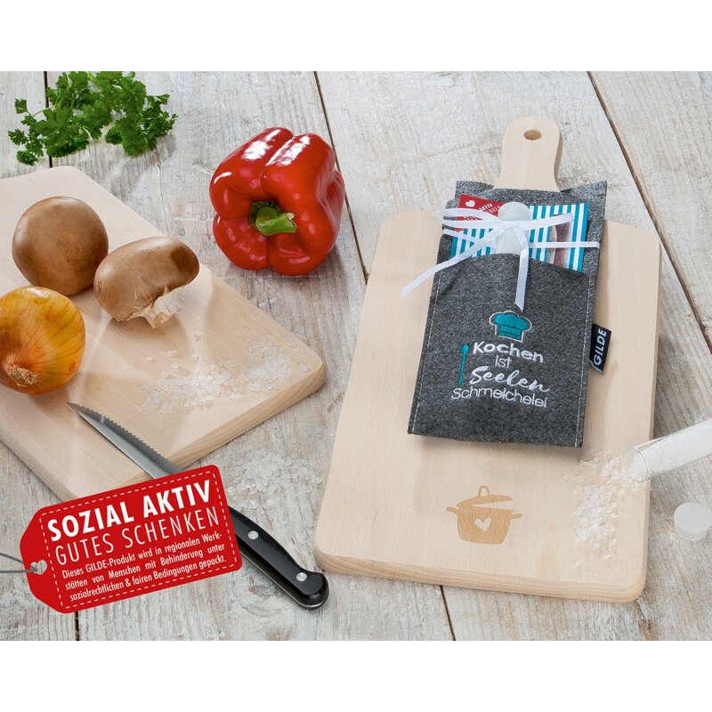 Gilde - Schneidebrett Holz - inkl. 50 g Meersalz - "Kochen ist Seelen Schmeichelei"
